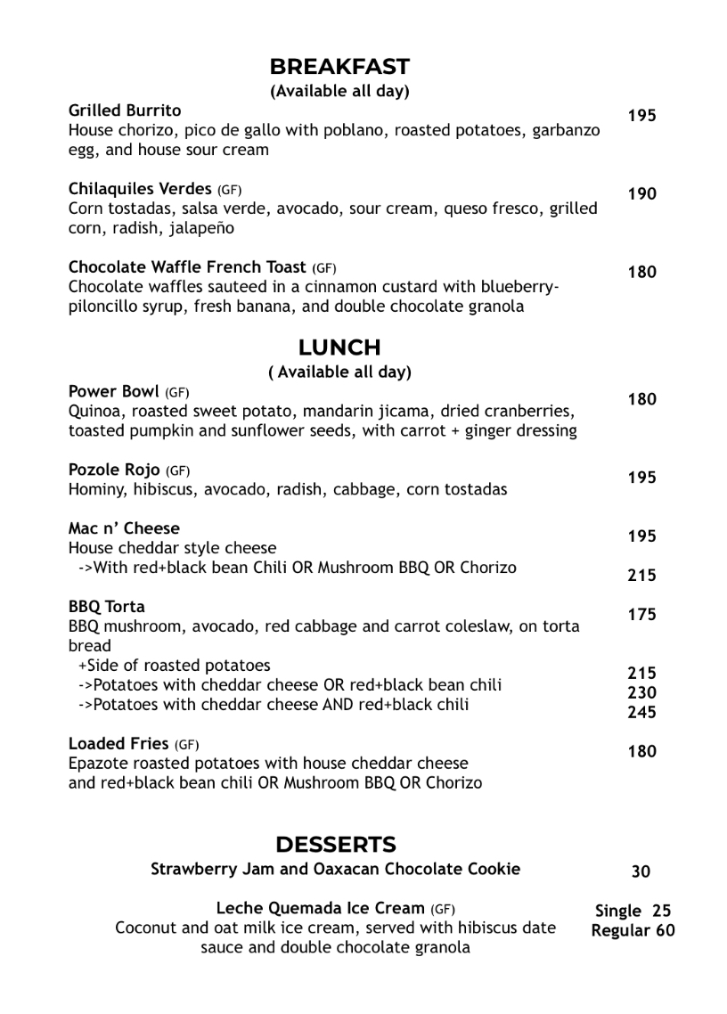 Guests can enjoy simple yet satisfying dishes like creamy Mac and Cheese or a hearty Breakfast Burrito to start the day, while mid-morning or afternoon visits might call for warm Chilaquiles Verdes or a nourishing Vegan Pozole. There’s a gentle balance between classic comfort foods and inventive plant-based flavors throughout the menu.